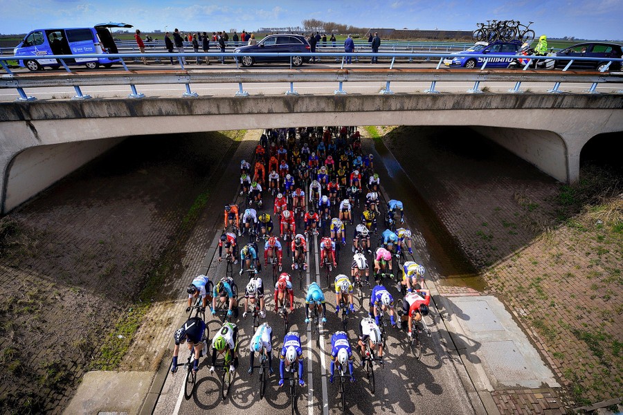 Read moreA pack of riders pedals under a bridge during the 106th edition of the Scheldeprijs (Grand Prix de l'Escaut) one-day classic cycling race from Borsele in the Netherlands to Schoten, Belgium, on April 4, 2018. #