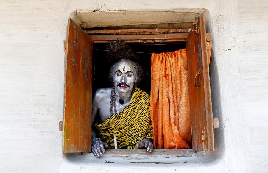 Read moreA devotee, dressed as Hindu god Shiva, looks out from a window as he waits to perform during the annual Shiva Gajan religious festival on the outskirts of Agartala, India, on April 13, 2018. #