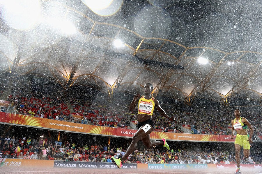 Read moreEmily Nanziri of Uganda competes in the rain during the women's 400-meter semi-finals during day six of the Gold Coast 2018 Commonwealth Games at Carrara Stadium on April 10, 2018. #