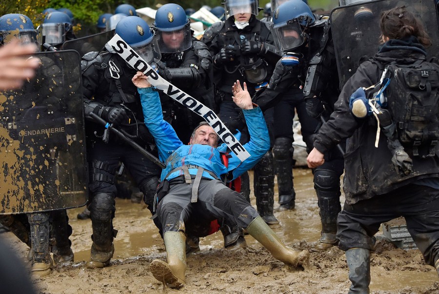 Read moreFrench gendarmes charge ZAD activists to clear the area of environmental protesters occupying the site of what had been a proposed new airport in Notre-dame-des-Landes on April 9, 2018. #