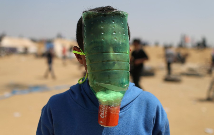 Read moreMazen Al-Najar, a Palestinian boy, covers his face with a bottle with cotton and coal to protect himself from inhaling tear gas fired by Israeli troops during a protest at the Israel-Gaza border in the southern Gaza Strip on April 6, 2018. #