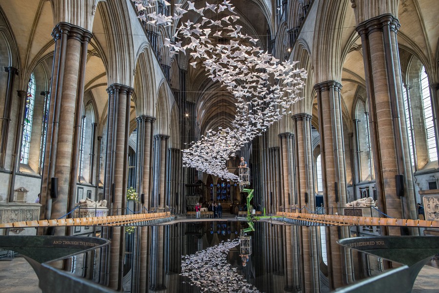 Read moreArtist Michael Pendry adds a white origami dove to his art installation "Les Colombes," which is being installed at Salisbury Cathedral on May 10, 2018, in Wiltshire, England. The art installation, which features a flock of around 2,500 white origami doves flying the length of the cathedral nave, opens to the public on May 12. Community groups in Salisbury have been encouraged to write their own messages and fold their own doves. The artwork's installation comes just over two months since the nerve agent attack in the city and while the clean-up continues the artist hopes the artwork carries a message of resilience, peace and hope. #
