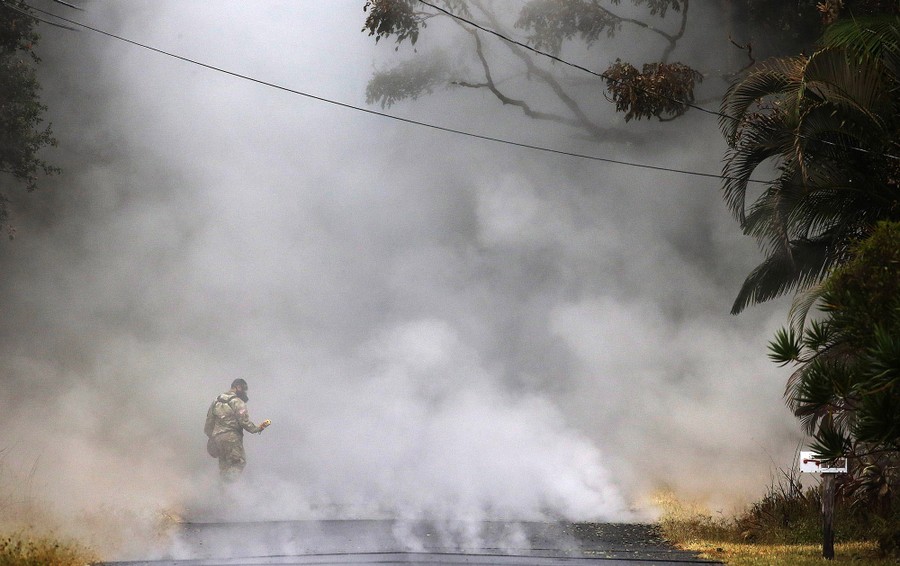 Read moreU.S. Army National Guard First Lieutenant Aaron Hew Len takes measurements for sulfur dioxide gas at volcanic fissures in the Leilani Estates neighborhood, in the aftermath of eruptions from the Kilauea volcano, on Hawaii's Big Island on May 8, 2018, in Pahoa, Hawaii. Leilani Estates residents have been allowed to return during the day to inspect property and remove belongings. Officials have confirmed 26 homes have now been destroyed by lava in the neighborhood. #