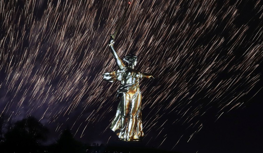 Read moreFireworks explode over the statue "Motherland Calls," a World War Two memorial located on the top of Mamayev Kurgan hill, during a light and laser show dedicated to the 73rd anniversary of the victory over Nazi Germany in World War Two, in Volgograd, Russia, on May 8, 2018. #