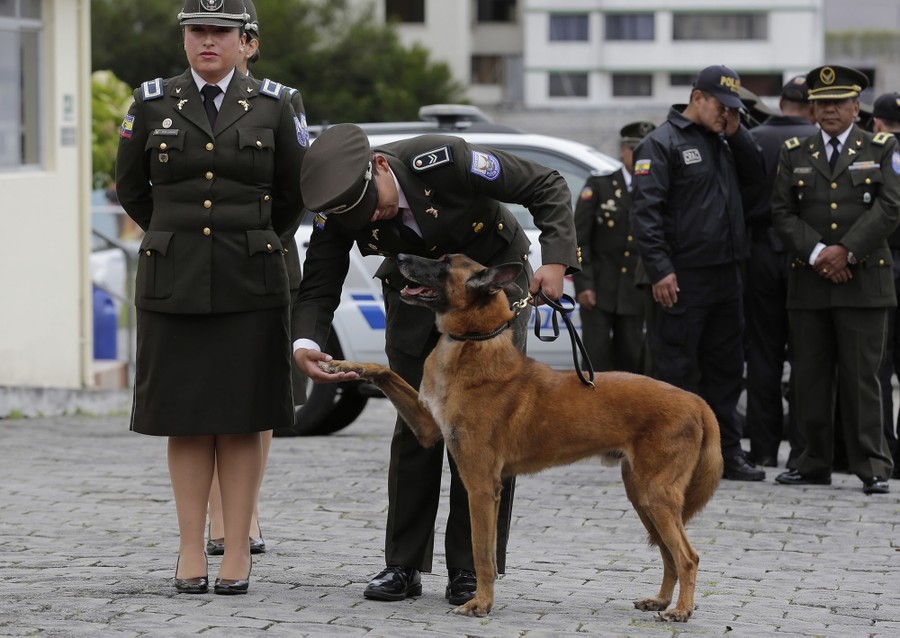 Read moreA retiring police dog spends a last moment with his handler before being handed over to his new caretakers in Quito, Ecuador, on May 9, 2018. The ceremony retired 61 police dogs who spent years sniffing out illegal drugs and who helped rescuers find victims. #
