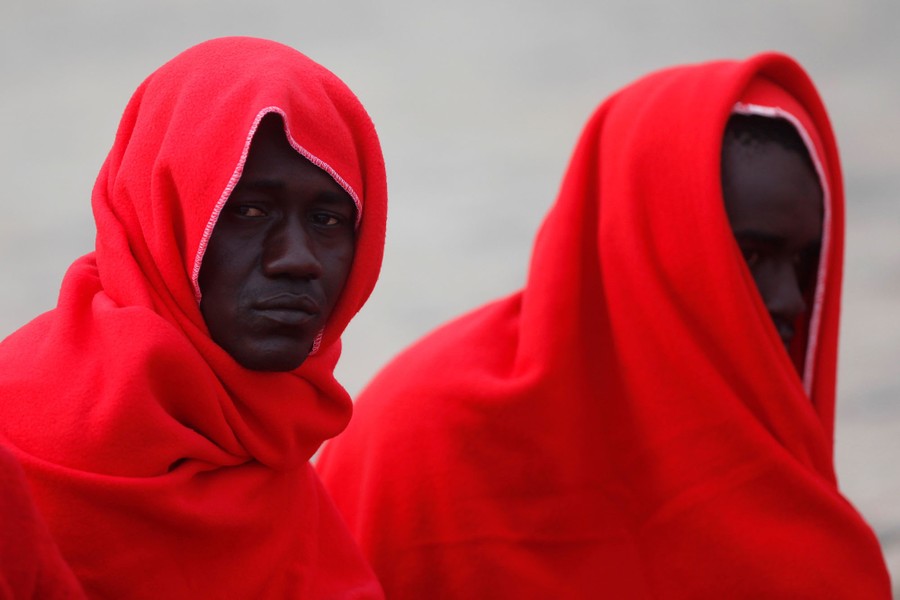 Read moreMigrants, part of a group intercepted aboard a dinghy off the coast in the Mediterranean Sea, rest after arriving on a rescue boat in the port of Malaga, Spain, on May 8, 2018. #