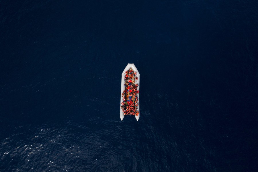 Read moreRefugees and migrants wait to be rescued by members of the Spanish NGO Proactiva Open Arms, after leaving Libya, trying to reach European soil aboard an overcrowded rubber boat north of the Libyan coast on May 6, 2018. Refugees and migrants from Bangladesh, Egypt, Nigeria, Ghana, Pakistan, Sudan, Libya, Eritrea, and Senegal were rescued from the boat. #