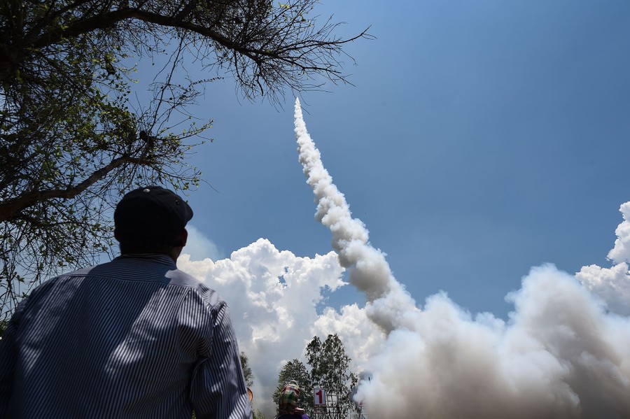 Read moreA man watches as a homemade rocket is launched during the "Bun Bang Fai" festival in Yasothon, Thailand, on May 13, 2018. The annual rocket festival celebrated in Thailand's rural Isaan region is aimed at prodding gods into unleashing rain ahead of the rice-farming season. #