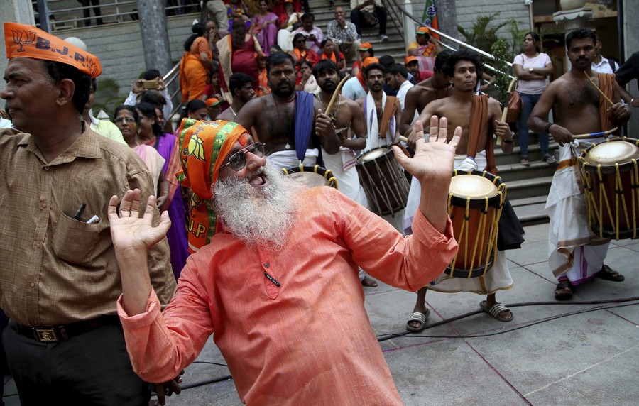 Read moreA supporter of India's ruling Bharatiya Janata Party dances to celebrate early leads for the party in the Karnataka state elections in Bangalore, India, on May 15, 2018. #