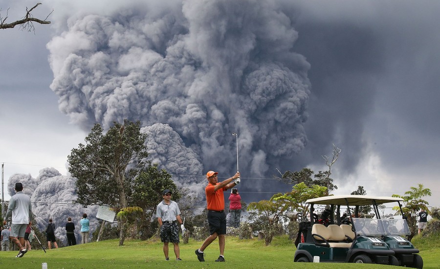 Read morePeople play golf as an ash plume rises in the distance from the Kilauea volcano on Hawaii's Big Island on May 15, 2018, in Hawaii Volcanoes National Park, Hawaii. The U.S. Geological Survey said a recent lowering of the lava lake at the volcano's Halemaumau crater had "raised the potential for explosive eruptions" at the volcano. #