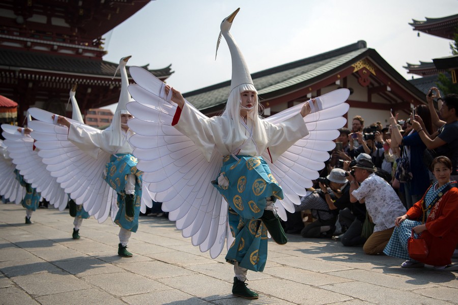 Read moreParticipants in swan costumes perform a dance during the Sanja Festival on May 18, 2018, in Tokyo, Japan. Sanja Festival is one of Japan's major festivals and is held annually in the Asakusa area of Tokyo. The three-day event starts with a grand parade with people in traditional costumes performing dances before around a hundred mikoshi (portable shrines) from the local communities are carried to and from Asakusa Temple watched on by an audience of locals and tourists. #