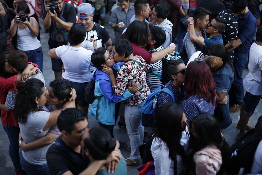 Read moreCouples kiss during a "kiss-a-thon" to mark International Day Against Homophobia, Transphobia, and Biphobia; in Alameda Park in central Mexico City, on May 17, 2018. A few dozen people participated in the brief kiss-a-thon, while others held signs offering free kisses and hugs. #