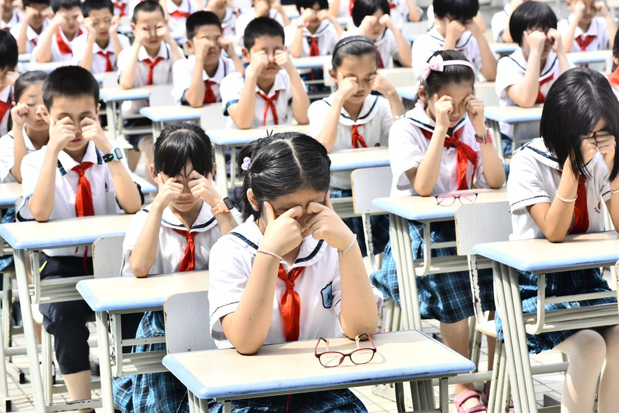 Read morePrimary students take part in an eye exercise event at Shushan District in Hefei, Anhui Province, China, on June 5, 2018. The eye exercise event was held to improve students' awareness of eye protection and to combat nearsightedness. #