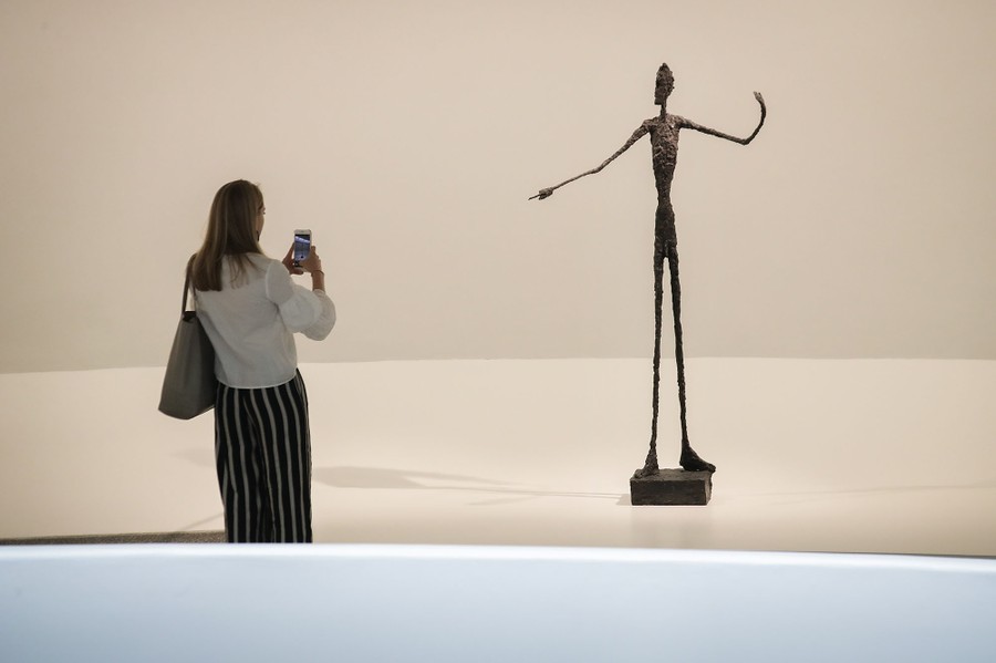 Read moreA woman stops and photographs "Man Pointing," a 1947 bronze sculpture at a retrospective exhibition of work by Swiss sculptor and artist Alberto Giacometti at the Guggenheim Museum in New York City on June 7, 2018. #