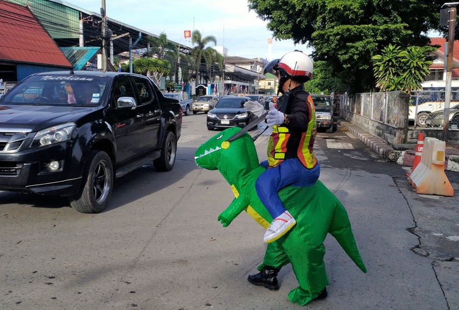 Read moreThai police sergeant Tanit Bussabong directs traffic, wearing a costume where he appears to ride a dinosaur, outside a school in Nakhon Nayok, Thailand, on June 4, 2018. Bussabong, who has around 20 different outfits including Minnie Mouse and a bear for his traffic duty outside the kindergarten, said his prehistoric uniform is teaching kids road safety and convincing parents to obey traffic laws. #