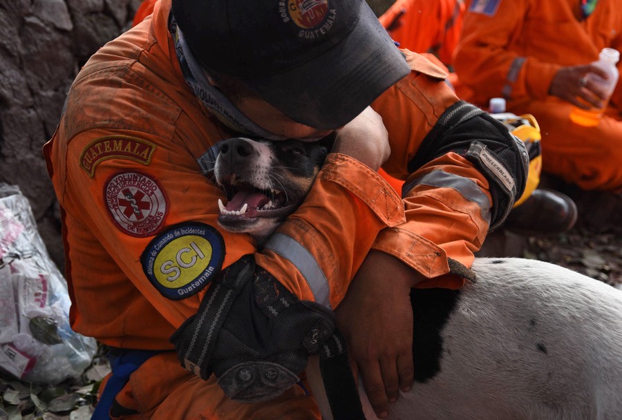 Read moreA volunteer firefighter hugs a dog during the search for victims of Sunday's Fuego volcano eruption in Alotenango, a municipality in Sacatepequez Department, southwest of Guatemala City, on June 6, 2018. #
