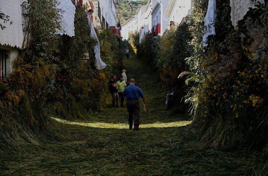 Read morePeople walk past decorations made with flowers and palm leaves during the festive day of Corpus Christi in the village Zahara de la Sierra in the Spanish province of Cadiz on June 3, 2018. #