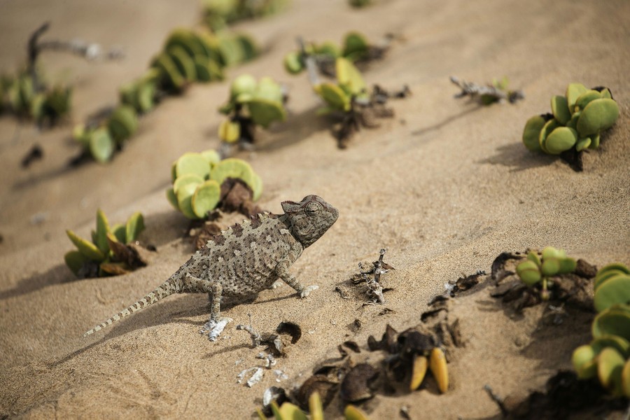 Read moreA Namibian desert chameleon climbs through vegetation and sand dunes in the desert area of Dorob National Park, part of the Namib Desert, on the outskirts of Swakopmund, on February 17, 2016. #