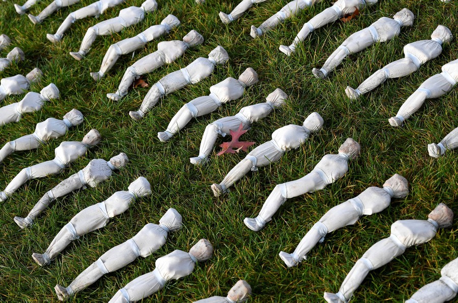 Read moreSome of the 72,396 shrouded figures that form part of the "Shroud of the Somme" installation by the artist Rob Heard, placed in Queen Elizabeth Olympic Park, in Stratford, London, on November 7, 2018. #