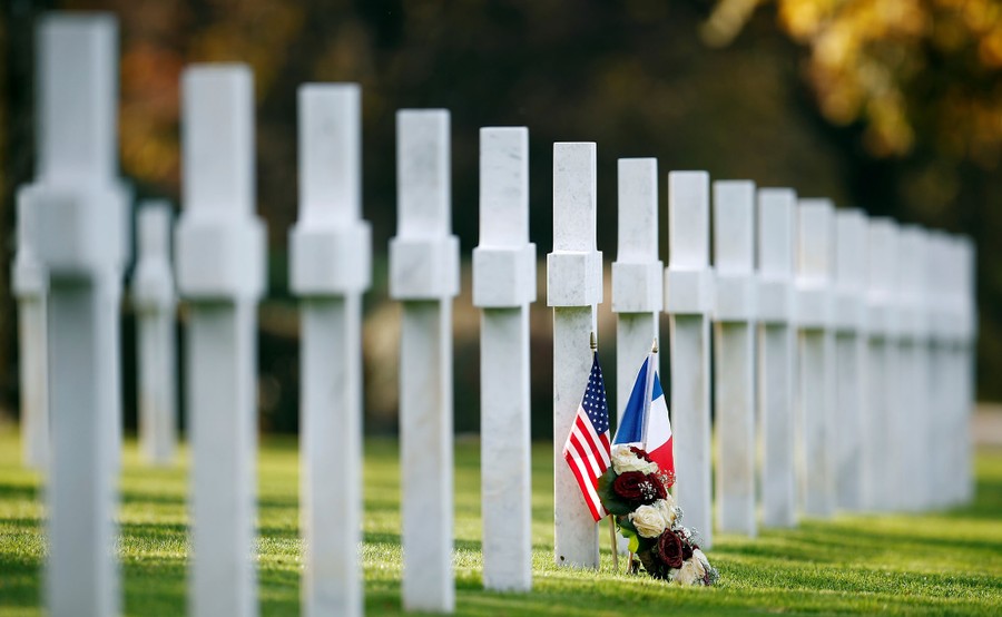 Read moreA white rose, a French flag, and a U.S. flag sit placed in front of a tombstone at the World War I Meuse-Argonne American Cemetery and Memorial in Romagne-sous-Montfaucon, near Verdun, on November 6, 2018. #