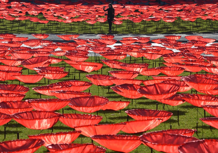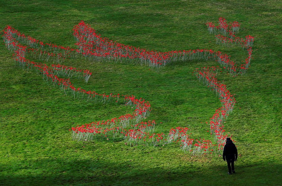 Read moreA visitor looks at a dove-shaped formation of thousands of artificial red poppies, made out of red bottle tops, at the Botanic Garden in Meise, to mark the centenary of the end of the First World War in Belgium, on November 2, 2018. #