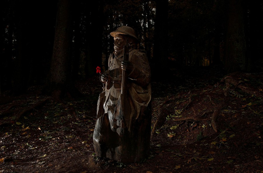 Read moreA wooden statue depicting a Poilu (French soldier in World War I) by the French artist Jean Bergeron is seen on the spot where the remains of 26 soldiers were discovered in 2013 in the destroyed village Fleury-devant-Douaumont, France, photographed on November 5, 2018. #