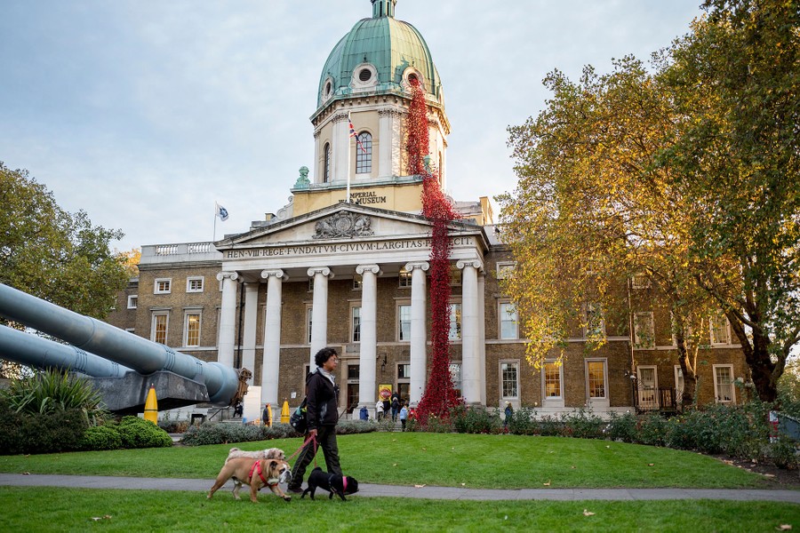 Read moreThe Weeping Window poppy installation, by the artist Paul Cummins and the designer Tom Piper, is pictured outside of the Imperial War Museum in London on October 31, 2018. Weeping Window is a cascade comprising several thousand handmade ceramic poppies seen pouring from a high location to the ground below. #