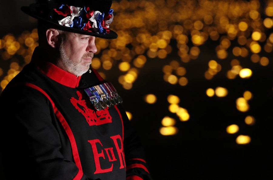 Read moreA Yeoman Warder, commonly referred to as a "Beefeater," stands among thousands of lit flames that form part of an installation called "Beyond the Deepening Shadow: The Tower Remembers," in the dry moat of the Tower of London, to mark the centenary of the end of World War I, in London, on November 6, 2018. #