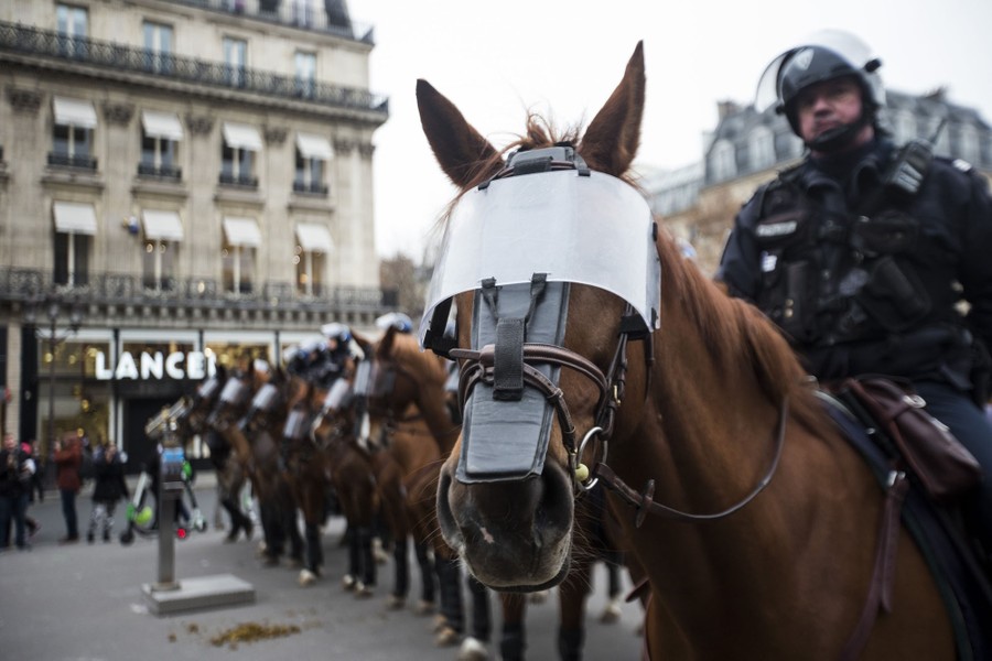 Read moreMounted police units take security measures around the National Academy of Music during a demonstration by the gilets jaunes, or "yellow vests," in Paris, France, on December 15, 2018. #
