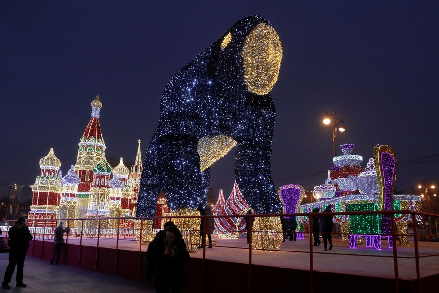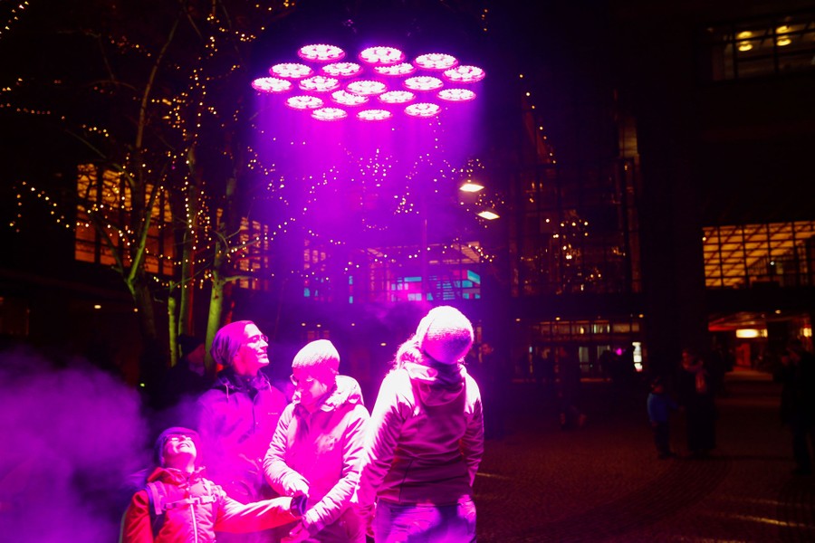 Read morePeople stand under a light installation by the Munich artist Manfred Beck of mbeam studio in front of the Gasteig municipal cultural center in Munich, Germany, on December 18, 2018. #