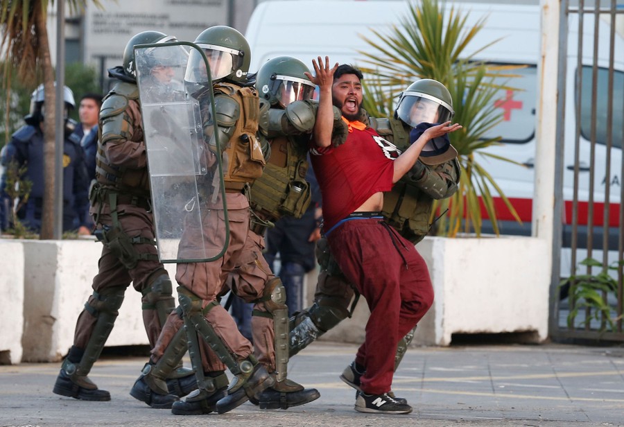 Read moreA Chilean dockworker is detained by riot police during a protest against the port operator TPS (South Pacific Terminal) demanding that temporary workers be included in collective bargaining in Valparaiso, Chile, on December 18, 2018. #