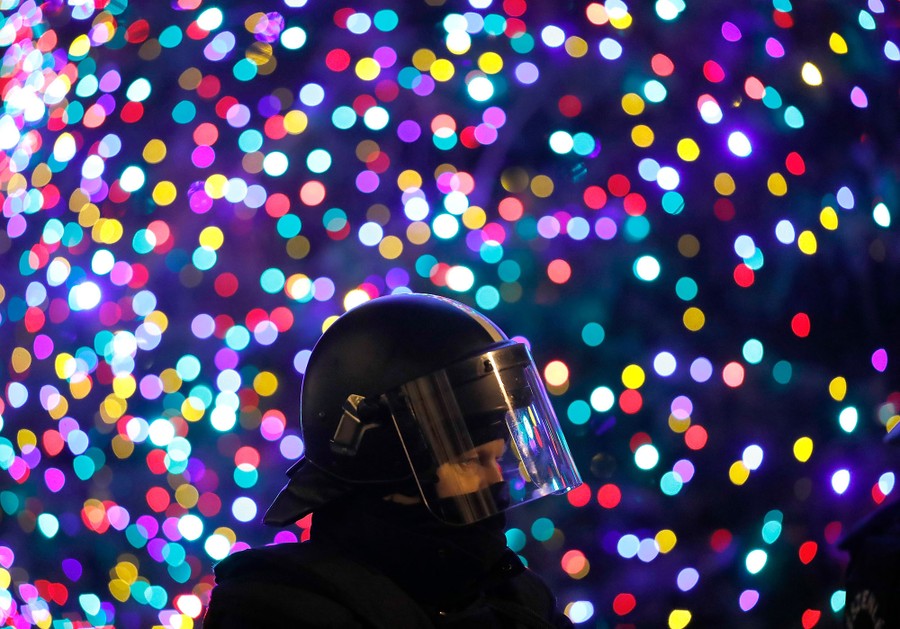 Read moreA riot-police officer stands front of a Christmas tree in Budapest, Hungary, as demonstrators protesting against recent legislative measures introduced by the government of Hungarian Prime Minister Viktor Orbán stand outside Parliament on December 14, 2018. #