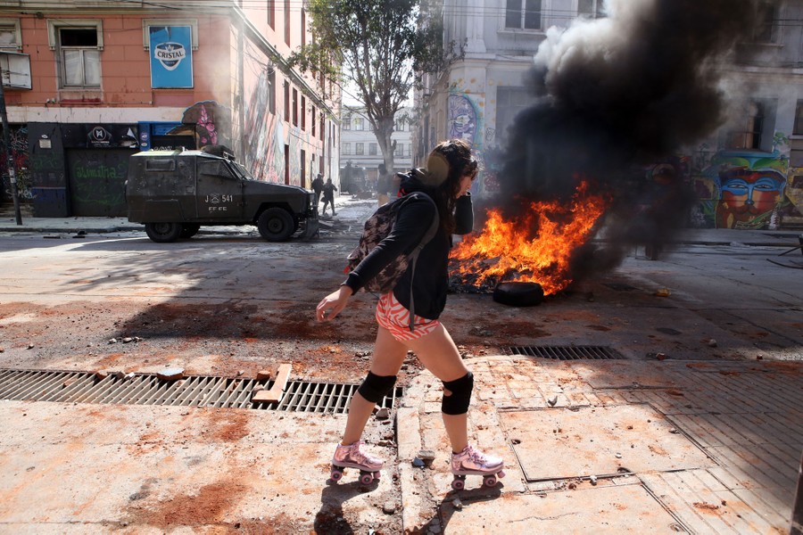 Read moreA woman walks on roller skates past a burning barricade as the port-workers protest continues on December 18, 2018, in Valparaiso, Chile. The strike that begun in November has caused merchant and transatlantic ships to be diverted to other ports, causing serious economic issues for the city of Valparaiso. The workers demand improvement in their payments and their working conditions, and they have announced that they will radicalize the protests if they don't receive answers from the government. #