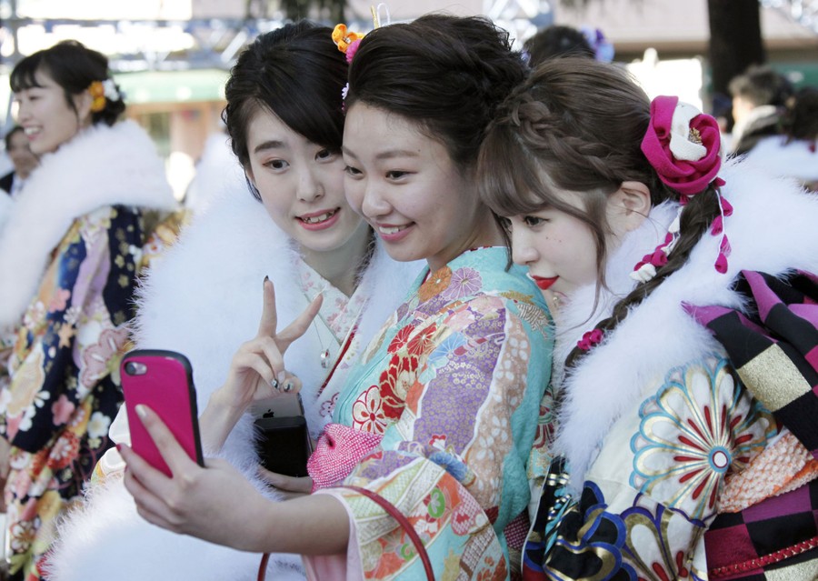 Read moreKimono-clad women who celebrate turning 20 years old pose for a selfie together following a coming-of-age ceremony at Toshimaen Amusement Park in Tokyo, on Coming of Age Day, January 14, 2019. #