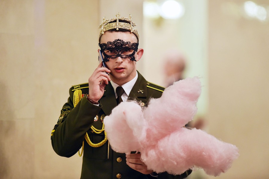 Read moreA Belarusian military cadet holds cotton candy while speaking on his cellphone during the Big New Year Ball at the Bolshoi Opera and Ballet Theatre in Minsk late on January 13, 2019. #
