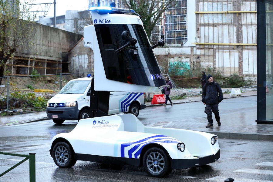 Read morePolice officers take security measures with a new vehicle, designed to observe social events, as students stage a protest against the government's climate policies in Brussels, Belgium, on January 17, 2019. #