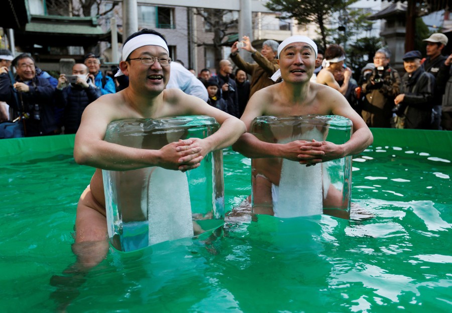 Read moreMen wearing loincloths hold bricks of ice after bathing in ice-cold water in a ceremony to purify souls and wish for good health in the new year at the Teppozu Inari Shrine in Tokyo, Japan, on January 13, 2019. #
