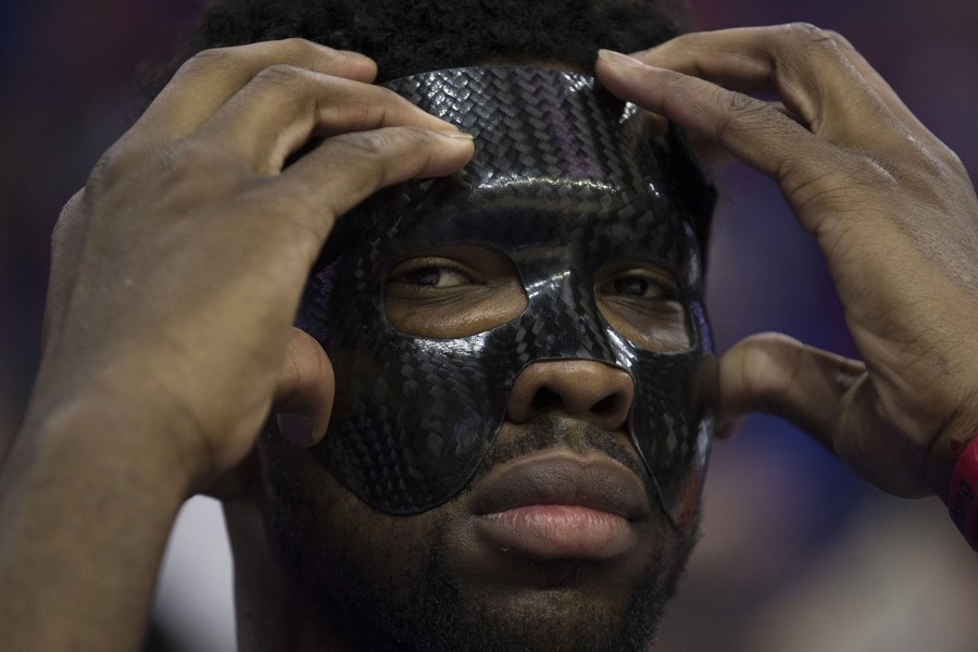 Read moreJoel Embiid of the Philadelphia 76ers puts on his protective face mask prior to Game One of the first round of the 2018 NBA Playoffs against the Miami Heat at the Wells Fargo Center on April 14, 2018, in Philadelphia, Pennsylvania. #