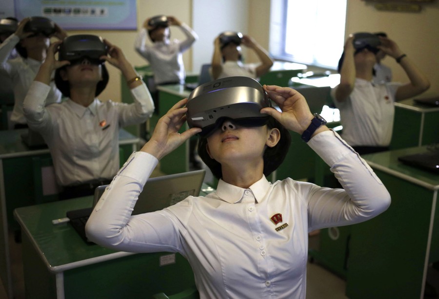 Read moreStudents wear virtual-reality goggles during a science class at Pyongyang Teachers' University, a teacher training college, in Pyongyang, North Korea, on June 14, 2018. #