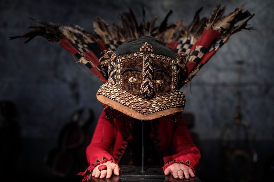 Read moreAn employee poses with a feathered helmet mask, called "Mwaash aMbooy mu shall," from the Kuba people, Democratic Republic of Congo, 19th century, during a press preview at Summers Place Auctions on May 30, 2018, in Billingshurst, England. #