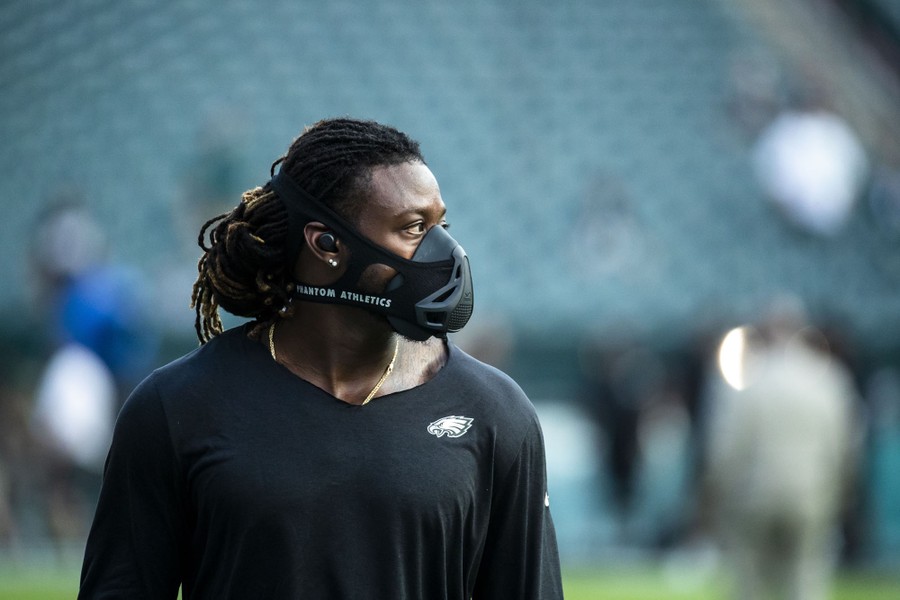 Read moreJay Ajayi of the Philadelphia Eagles warms up before the game while wearing a training mask at Lincoln Financial Field in Philadelphia, Pennsylvania, on September 6, 2018. #