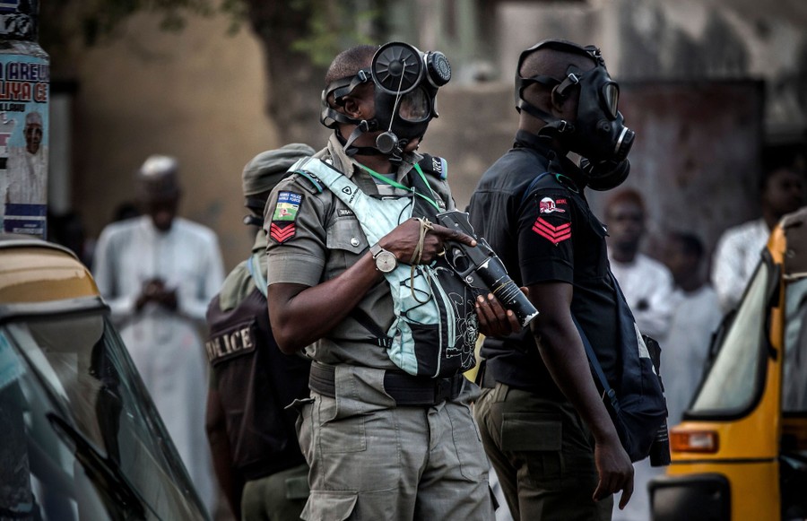 Read moreNigerian police wearing gas masks monitor an area where All Progressives Congress Party (APC) supporters celebrate initial results released by the Nigerian Independent National Electoral Commission in Kano, on February 25, 2019, two days after general elections. #