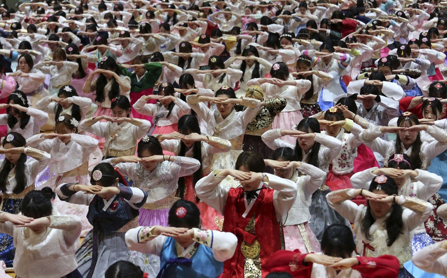 Read moreSouth Korean seniors clad in traditional attire bow during a joint graduation and coming-of-age ceremony at Dongmyung Girls' High School in Seoul on February 14, 2019. #