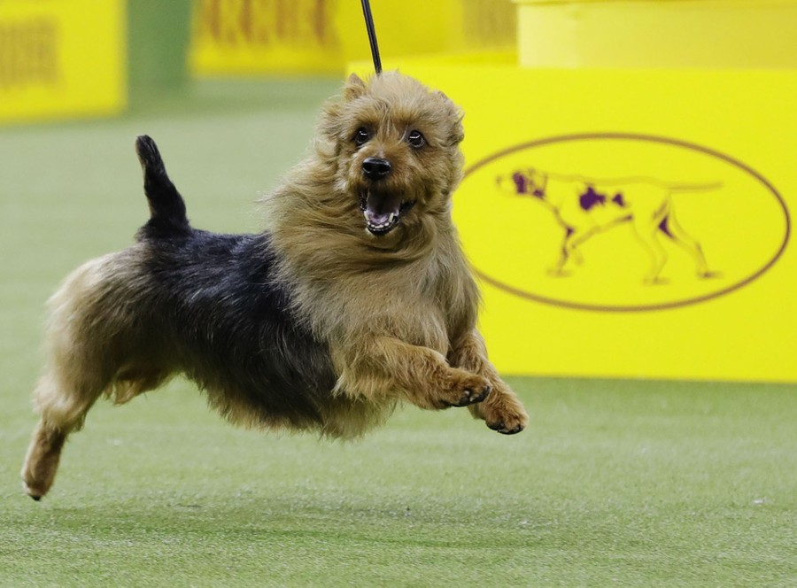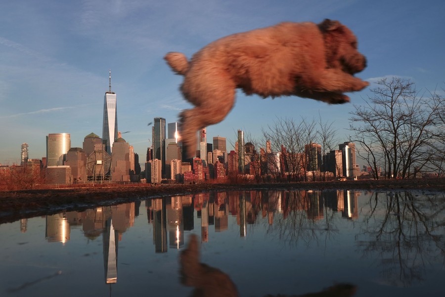Read moreA dog jumps over a puddle in front of the skyline of Lower Manhattan, including One World Trade Center, at sunset in New York City on February 14, 2019, as seen from Jersey City, New Jersey. #