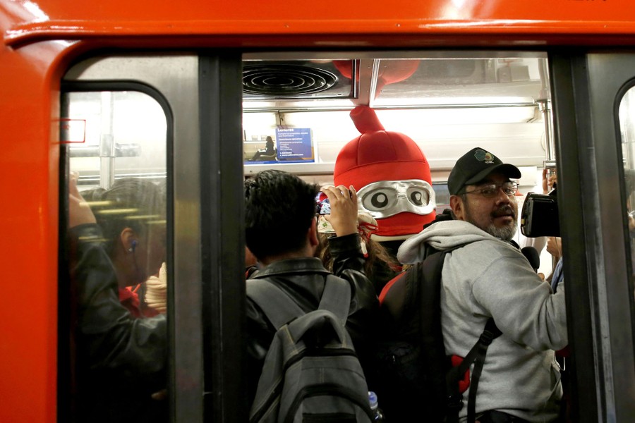 Read moreA man wearing a condom costume is seen inside a metro car on International Condom Day, celebrated the day before Valentine's Day, in Mexico City, Mexico, on February 13, 2019. #