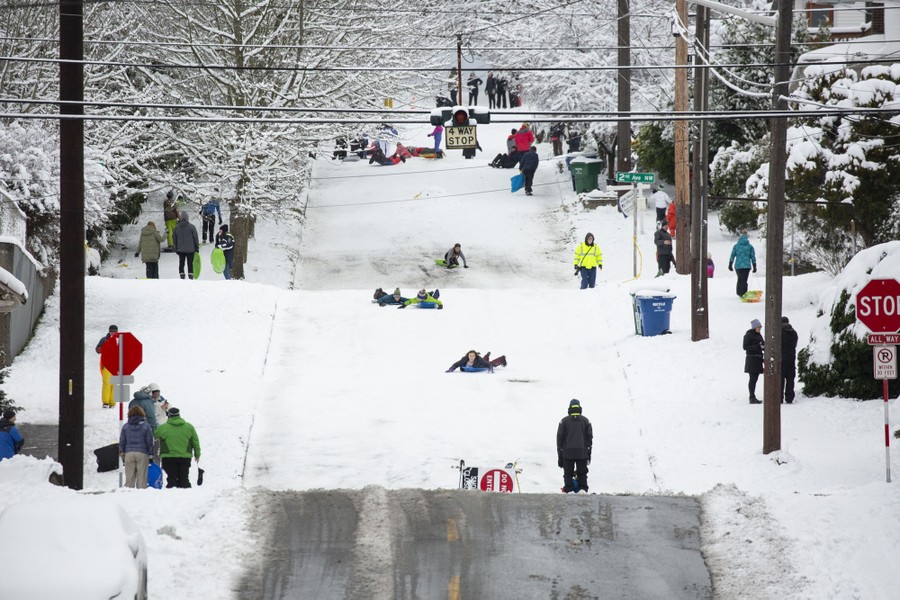 Read morePeople play on a hill in the Phinney Ridge neighborhood of Seattle after a large storm blanketed the city with snow on February 9, 2019. Seattle almost reached its yearly amount of snowfall in one day. #
