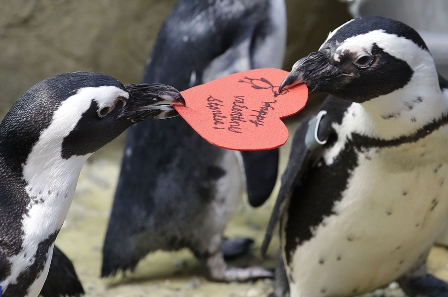 Read moreAfrican penguins compete for a heart-shaped valentine handed out by the aquarium biologist Piper Dwight at the California Academy of Sciences in San Francisco on February 12, 2019. #