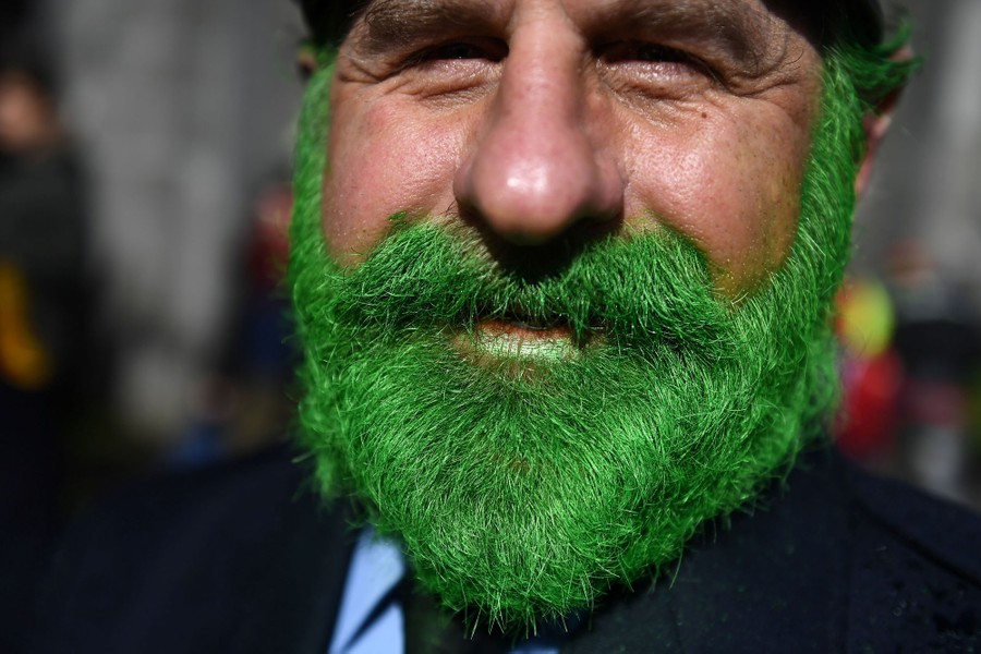 Read moreThe Irish wolfhound "Domhnall," the regimental mascot of the Irish Guards, and his handler, Drummer David Murray, attend the 1st Battalion Irish Guards St. Patrick's Day parade at Cavalry Barracks in Hounslow, England, on March 17, 2019. #