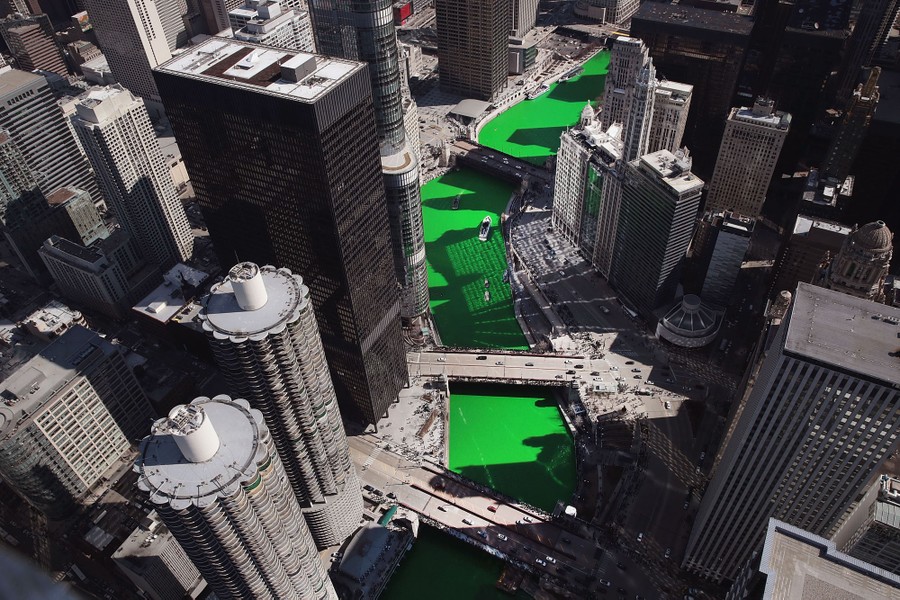 Read moreAn aerial view of the Chicago River as it winds its way through downtown after being dyed green in celebration of St. Patrick's Day, on March 16, 2019, in Chicago, Illinois. #