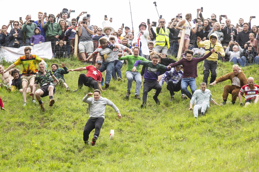 Read moreThe eventual winner, Max McDougall (front left), chases the cheese during the first race of the annual spring bank-holiday cheese-rolling event at Cooper's Hill, near Gloucester, England, on May 27, 2019. Traditionally held for villagers of Brockworth, today the event attracts people from around the world. #